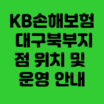 - KB손해보험 대구북부지점은 북구 권역 자동차·화재·장기보험 거점으로, 평일 9~18시 방문 상담 및 모바일 청구가 모두 가능하다.